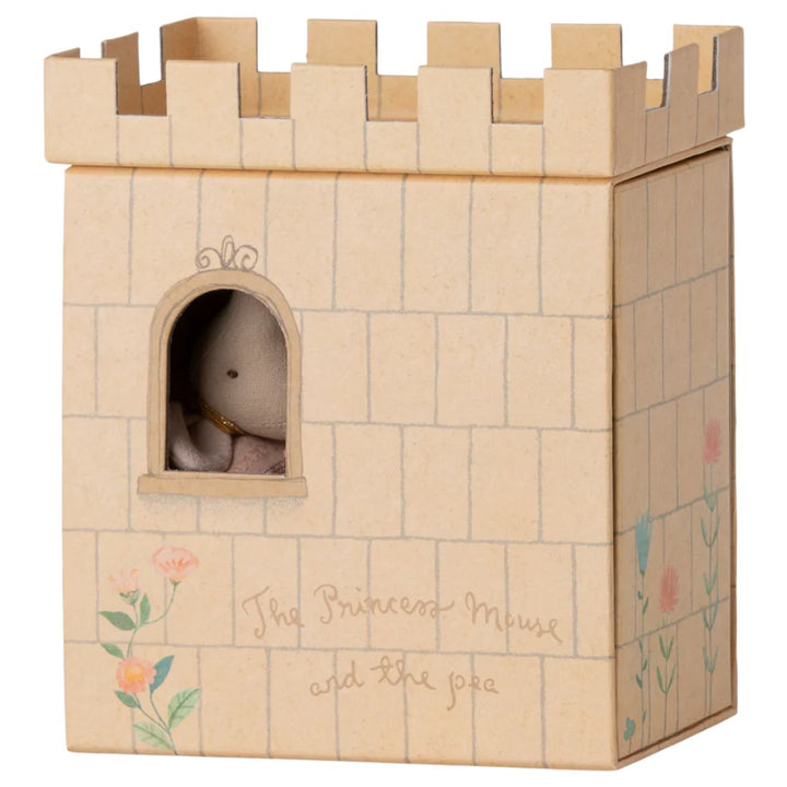 Maileg Princess and the pea, Big sister mouse - A castle shaped box has a cutout window, with the princess mouse face peeping through - Bella Luna Toys