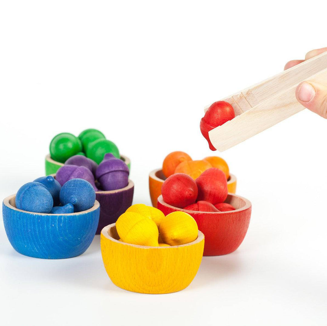 As with all toys from Grapat, your child will be the one who decides how this game is played. Stack the bowls or line them up! Use the tongs to pick up acorns to practice dexterity skills. When dropped, they bounce and roll around, making it a delight for little ones to try and contain.