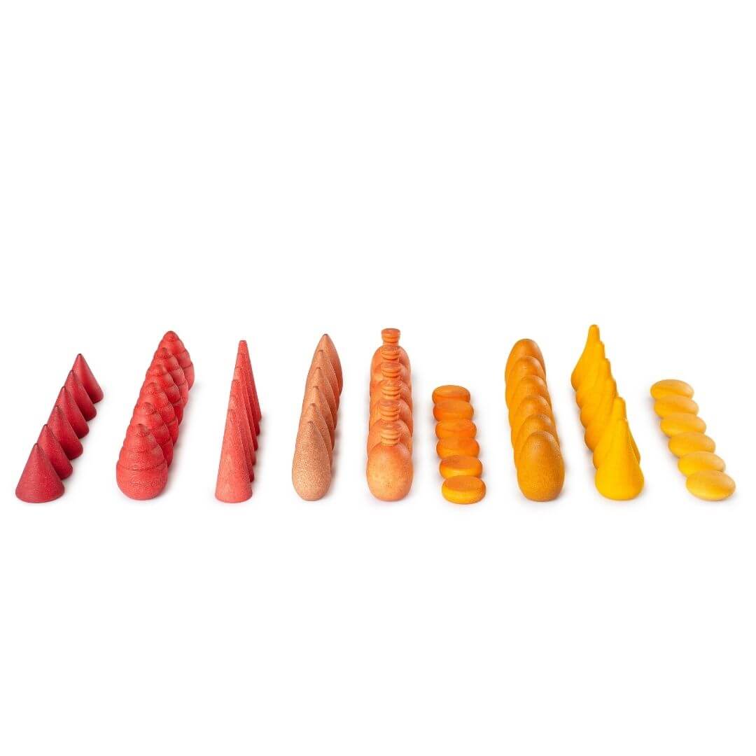 Hold the warmth of the sun in your hands. The Grapat Mandala Mix Warm is a glowing collection of wooden mandala pieces in cozy reds, golden yellows, and rich oranges. With 81 pieces in a beautiful variety of shapes and tones, this bundle invites children to design intricate mandalas, build textured landscapes, and explore pattern-making in endlessly creative ways. These pieces may become flames in a storytelling scene, autumn leaves, market treasures to gather and trade, or mathematical tools for counting and grouping.