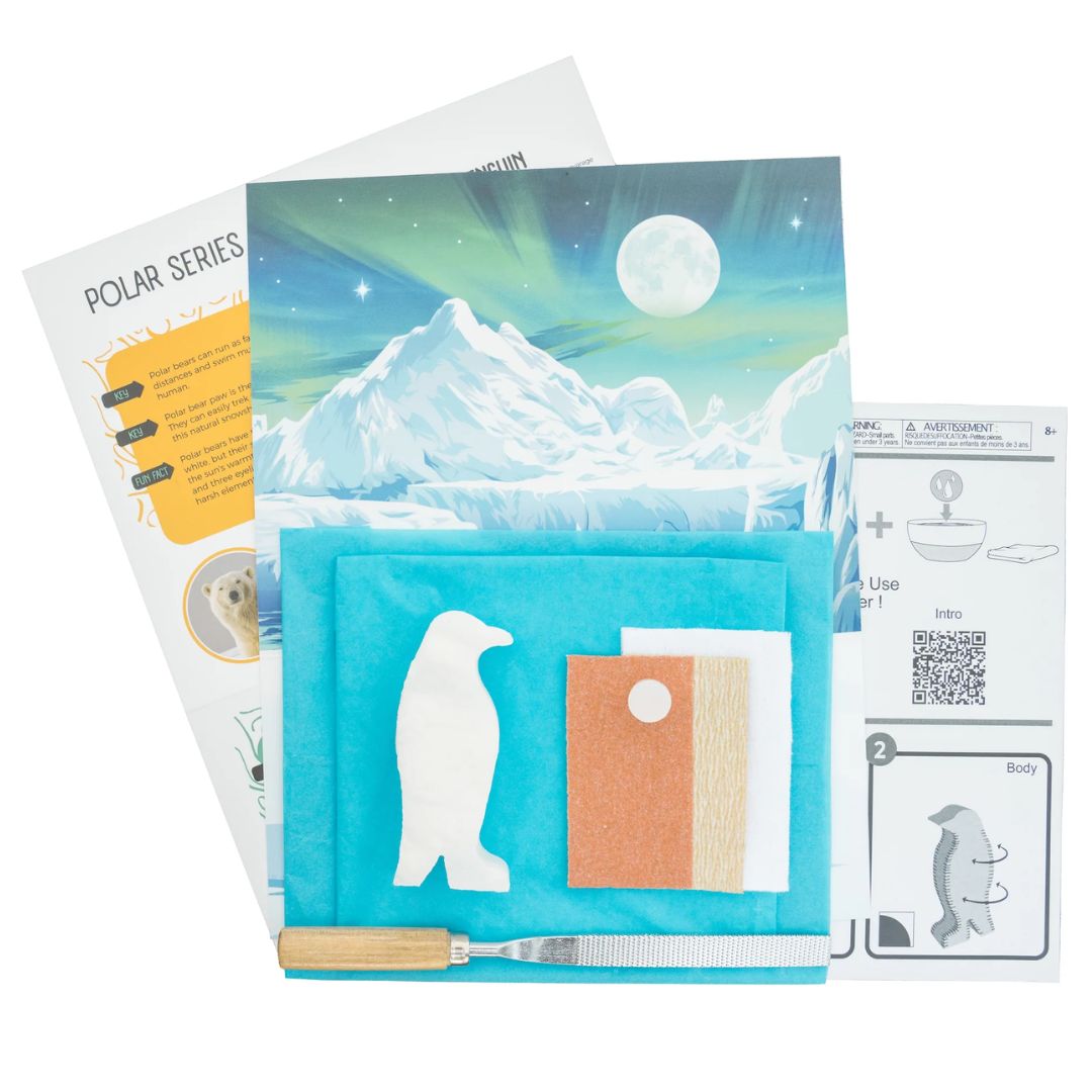 Using water to shape the stone with the included supplies, children 8 and up can watch as the penguin emerges and the semi-translucent alabaster finishes into a beautiful white. The kit takes approximately two hours to complete.