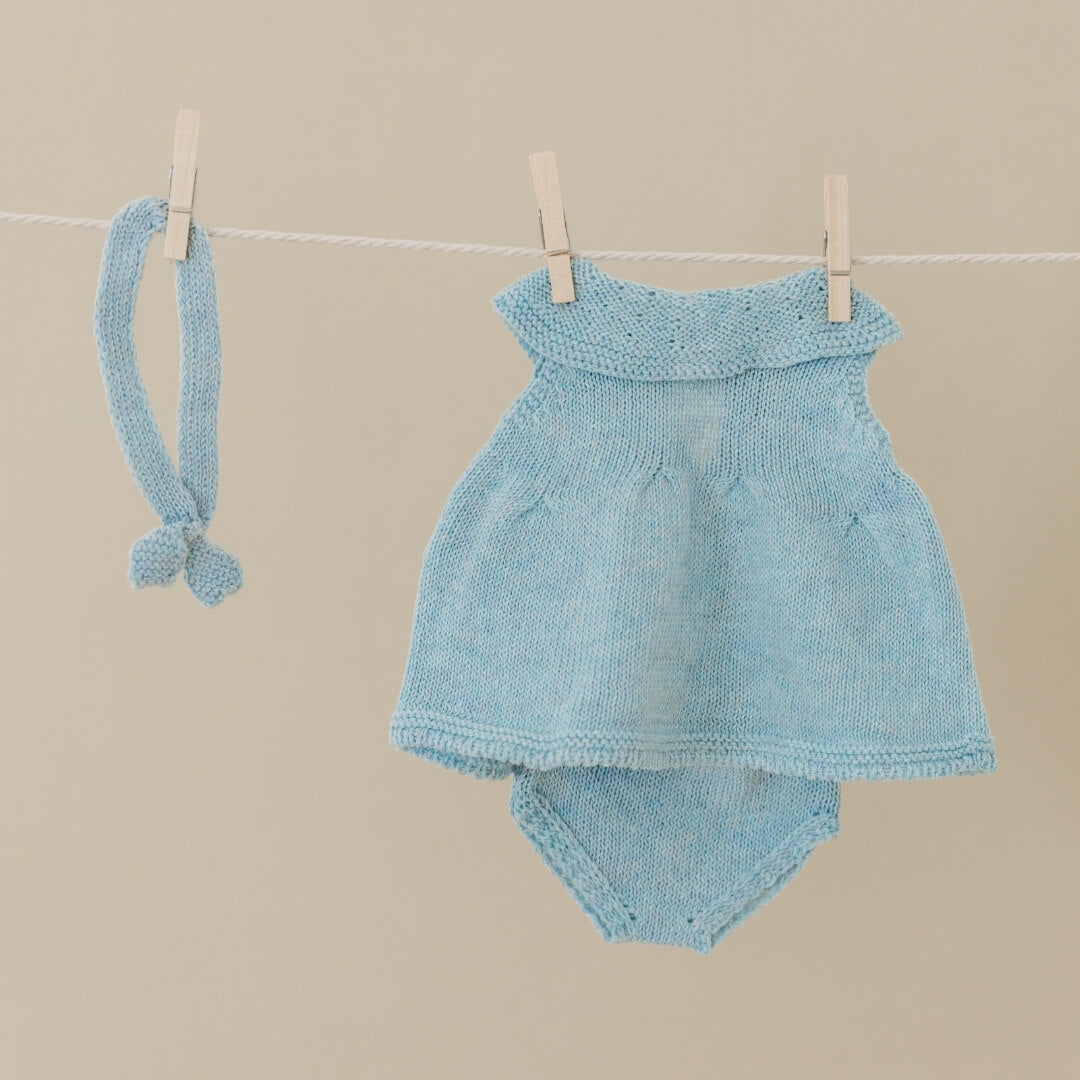 A knitted soft blue 3-piece outfit for 15-inch Miniland Dolls, featuring a soft knit dress, matching bloomers, and a headband in natural tones, made from recycled materials for an eco-friendly touch.