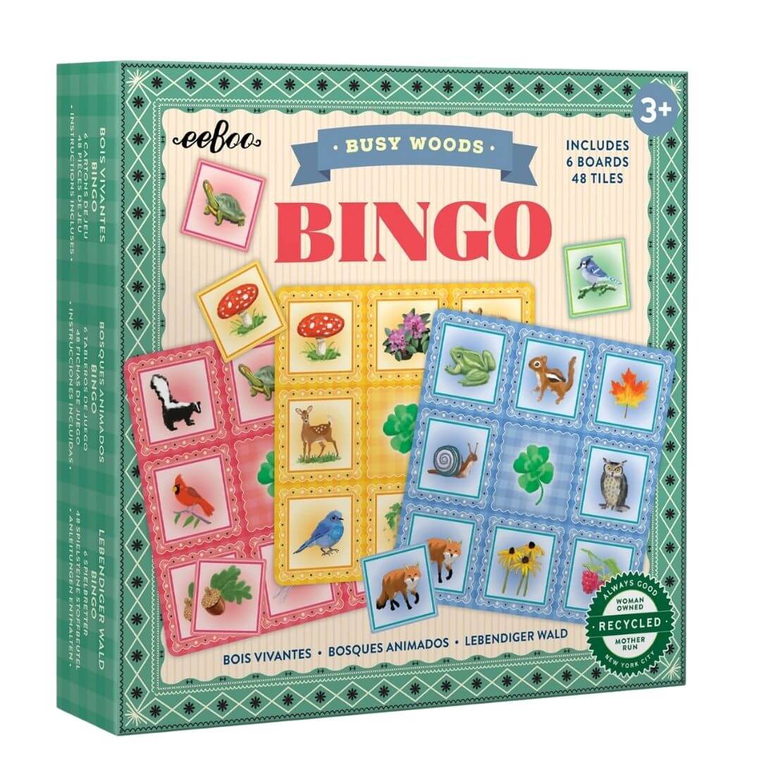 The woods are alive with the sound of BINGO with this beautifully illustrated Busy Woods Bingo Game from eeBoo. Each sturdy 2 inch by 2 inch bingo square features sweet and gentle woodland creatures illustrated by Saxton Freymann.