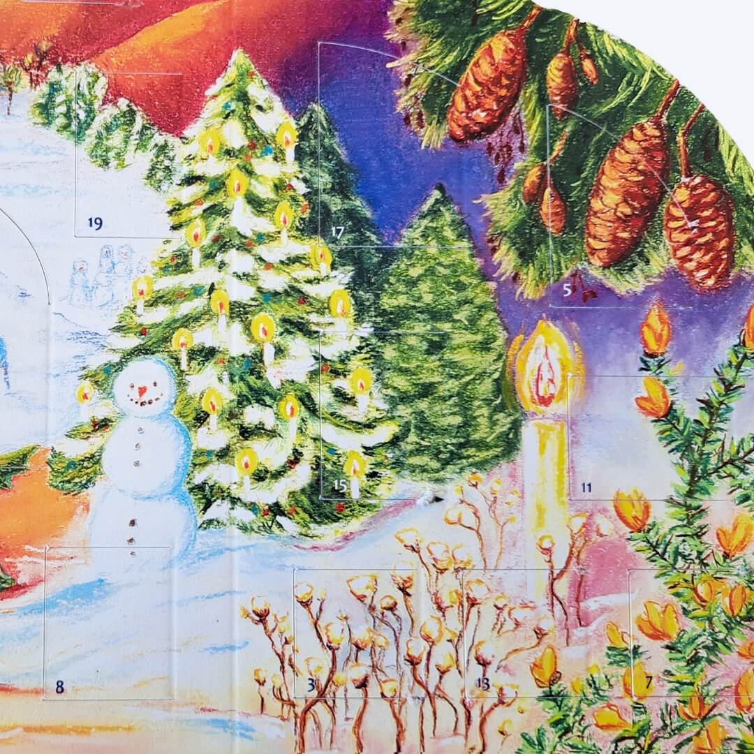 Close details on the Waldorf Lights of Advent calendar depicting holiday scenes.