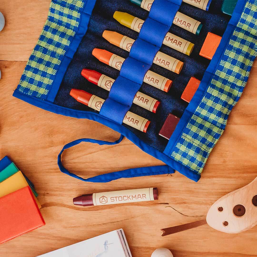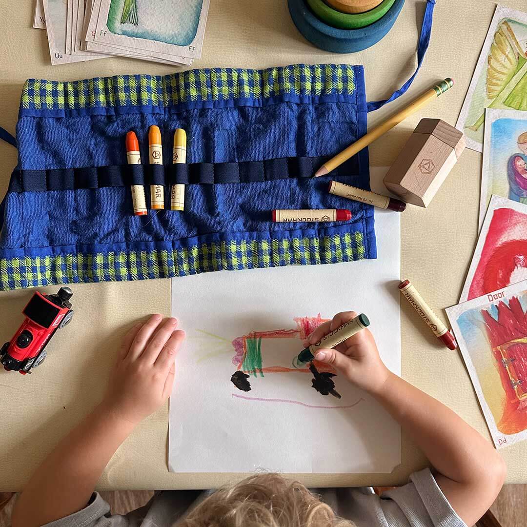 The pouch rolls up to store and carry crayons when not in use and can be secured with the matching cotton ties.