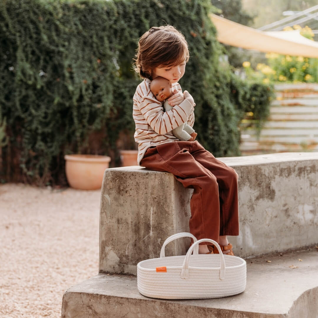 A child playing with a Miniland doll next to the cotton basket doll carrier.