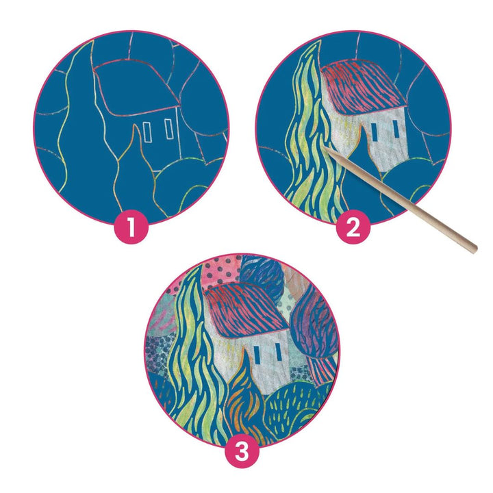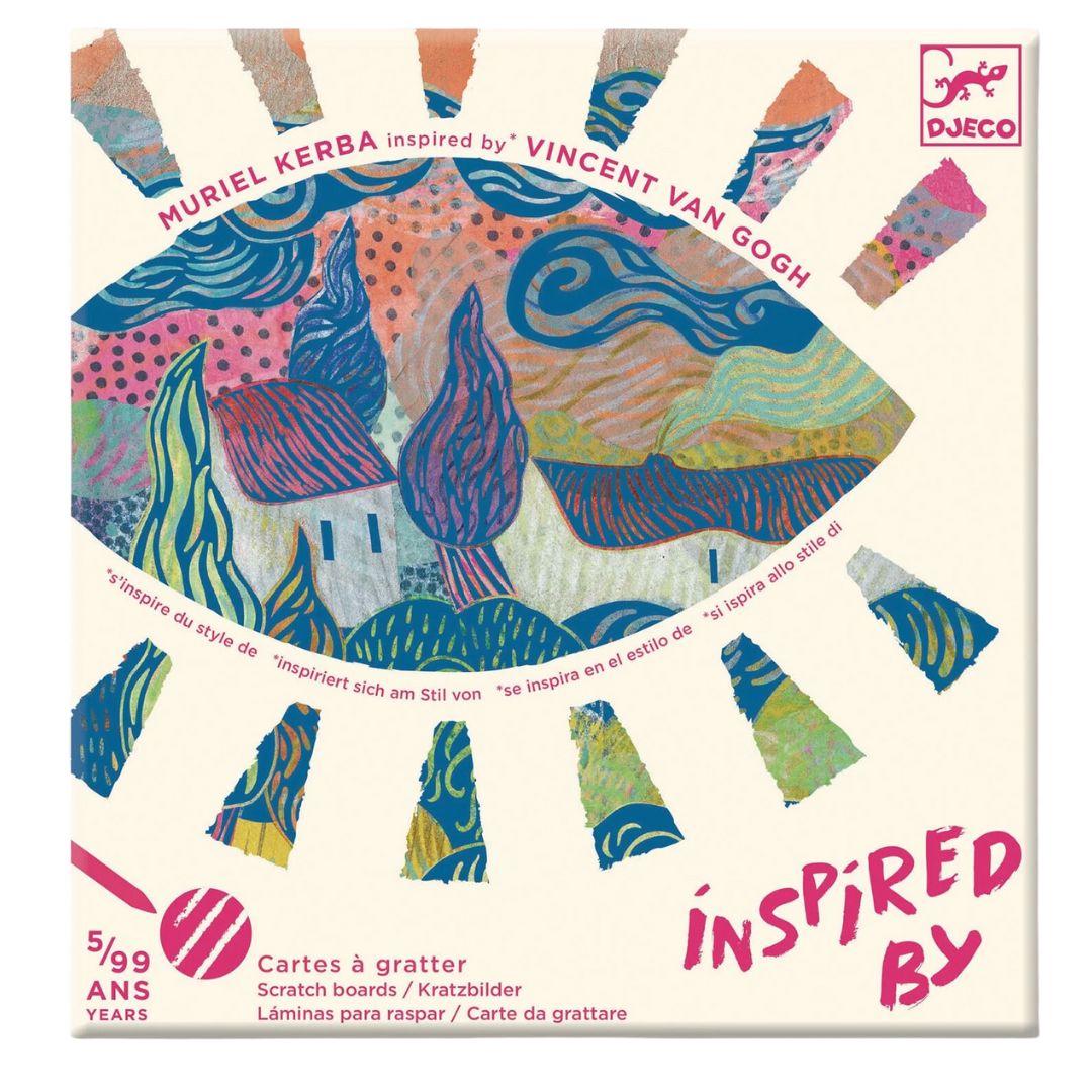 Using the included wooden stylus, children will scratch the surface of the cards, revealing the Van Gogh-inspired motifs created by illustrator, Murial Kerba. Each image is gradually revealed allowing the landscapes to come to life.