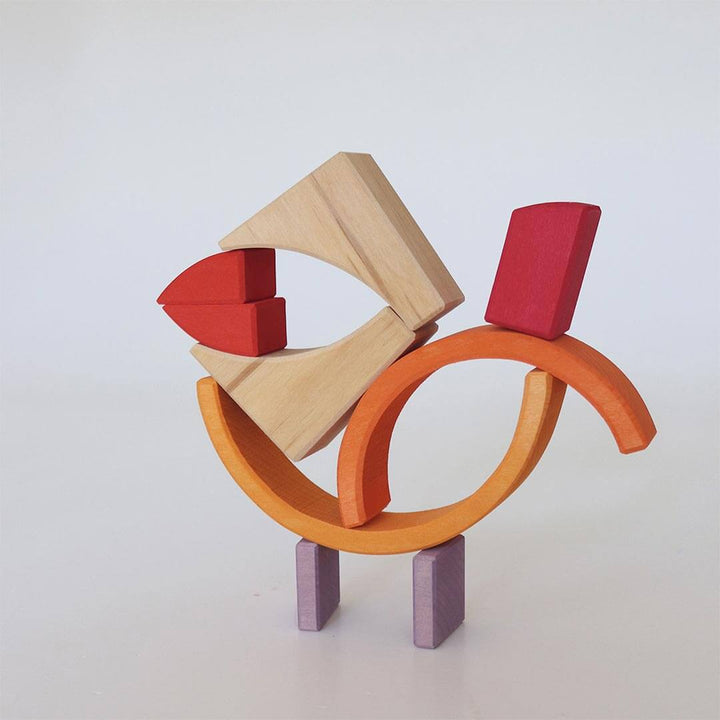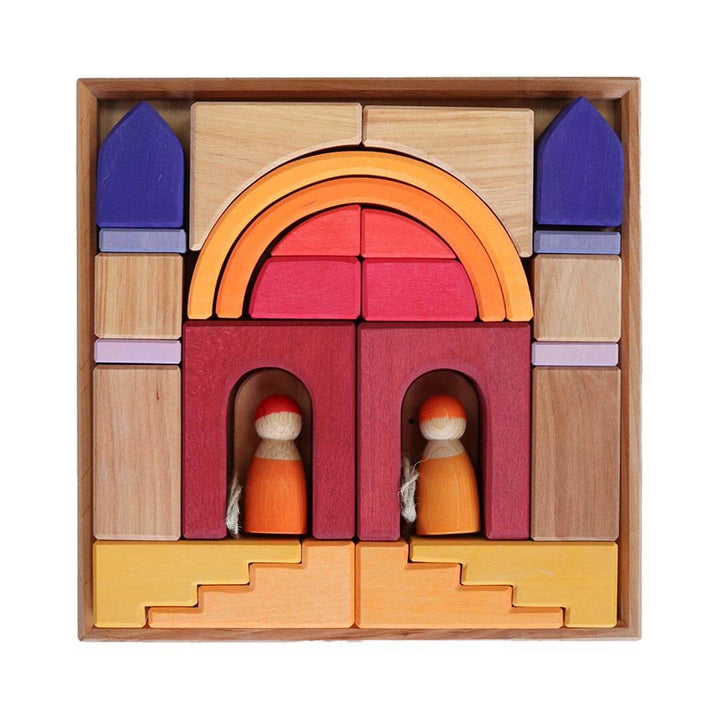This small world play set is a hybrid of Grimm's larger building sets and arrives in a solid wood tray. The wide variety of building materials include all kinds of shapes to allow imaginative free building which perfectly complement all other Grimm’s products.