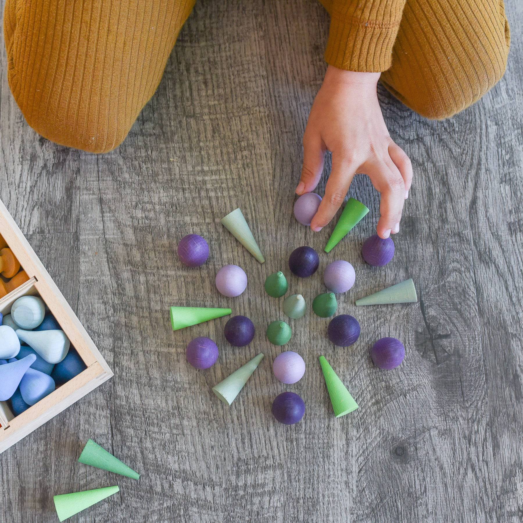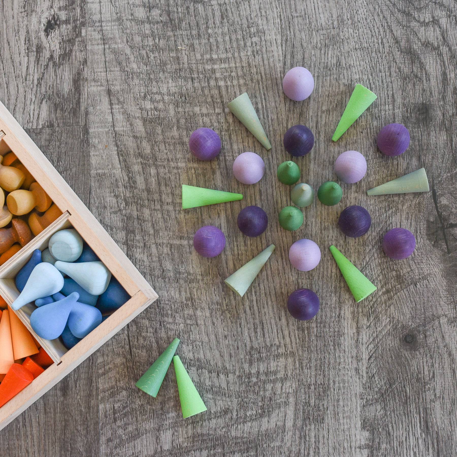 There are endless possibilities for loose parts play with Grapat Purple Eggs Wooden Mandala pieces.
