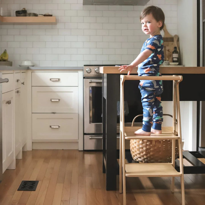 This durable and sturdy kitchen tower includes a removable rear safety bar, and an adjustable top platform to accommodate growing children from 16 months old to up to 9 years old.