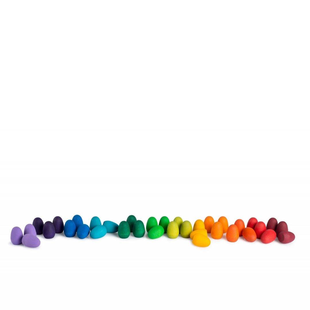 Grapat Mandala Wooden Rainbow Eggs organized by color in a somewhat organic line