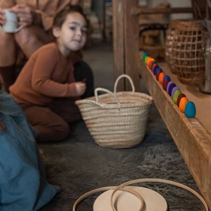 Adult and child crouched down in background, looking towards Grapat Mandala Wooden Rainbow Eggs lined up along shelf nearby