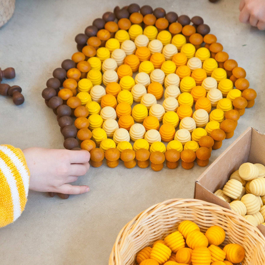 This bee-utiful Grapata Wooden Mandala Beehive Set includes 36 small wooden beehive-shaped pieces in gradated shades of yellow.