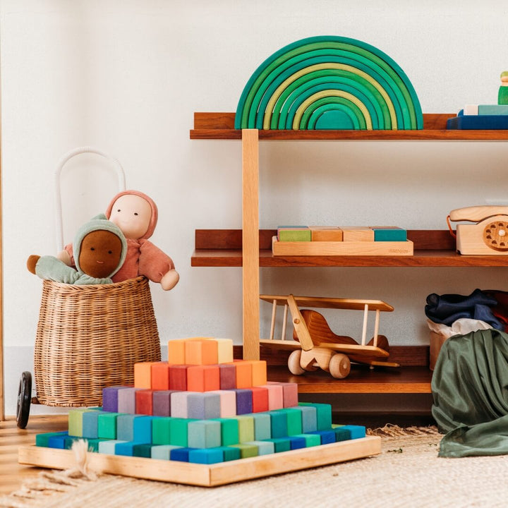 Children will have hours of fun playing with this new, oversized version of our popular Stepped Pyramid Math Blocks from Grimm's Spiel & Holz of Germany.