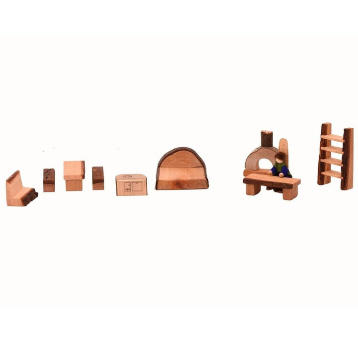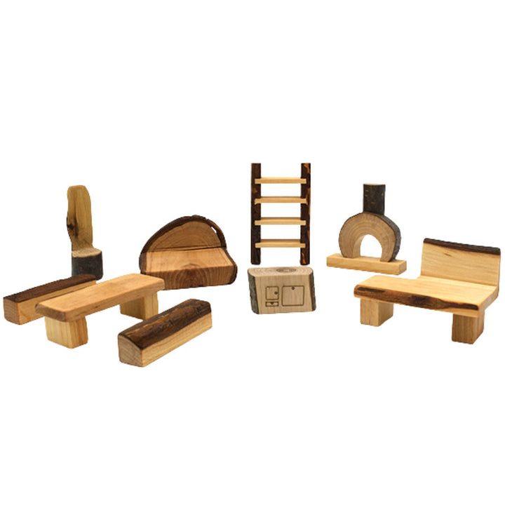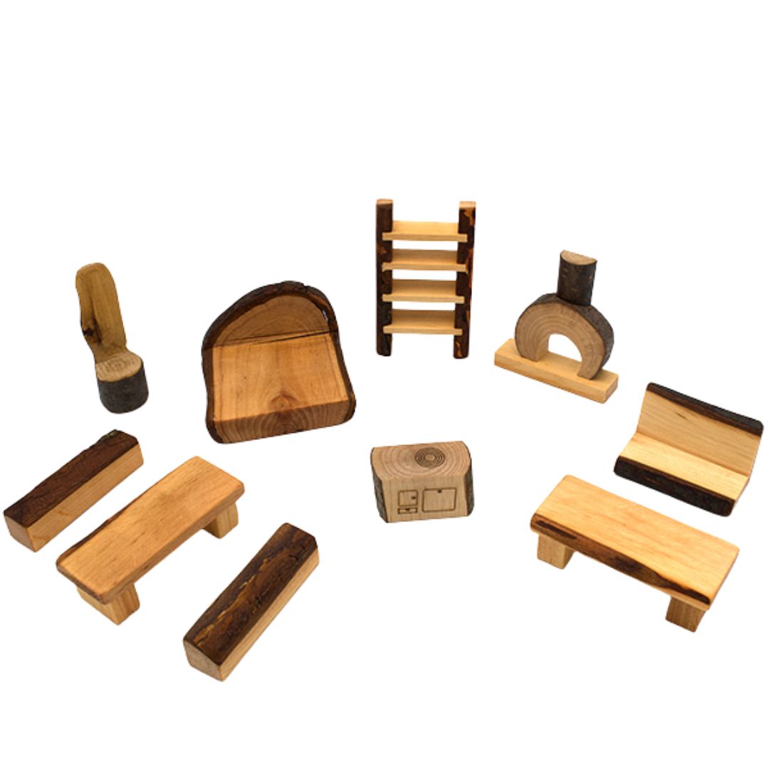 Welcome home to the Shire! This ten-piece Shire Dollhouse Branch Furniture Set from Magic Wood will make any dollhouse, fairy house, or treehouse play set up feel enchanted.