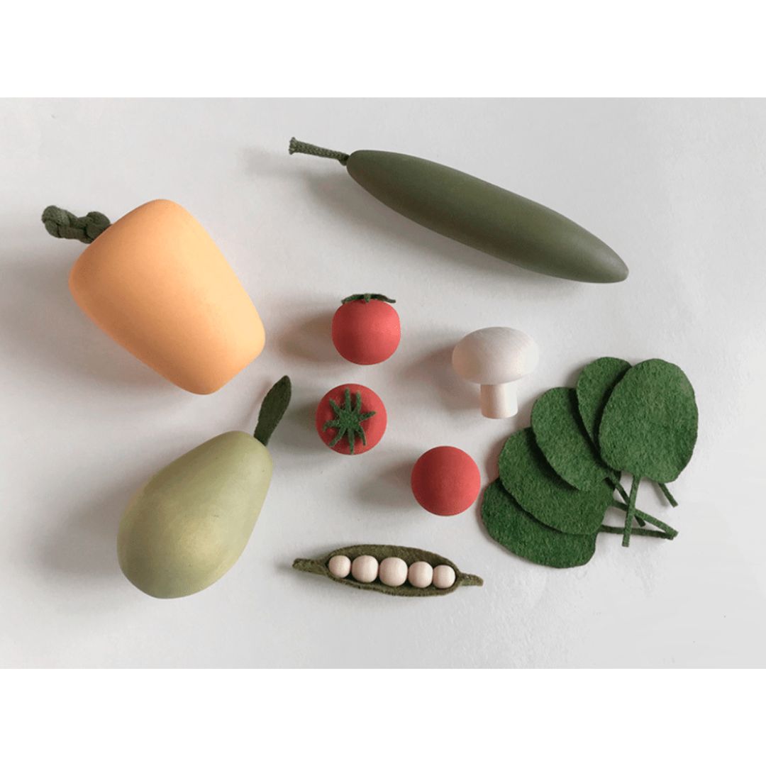The set includes a bounty of delicious and nutritious vegetables including a half of an avocado, a cucumber, a pepper, a mushroom, a pea in a felt pod, five felt spinach leaves, and three cherry tomatoes.